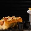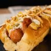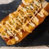 Pan artesanal, salchicha tipo alemán rellena de queso, doble tocineta, queso americano, cebolla caramelizada, pepinillos y ripio de papa artesanal.